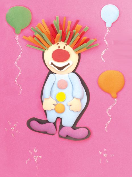 y utilizando una tela planchamos el traje del payaso hasta que quede cóncavo. Pegamos la cabeza, el vestido y los zapatos a un fomi negro, más grueso que los anteriores.